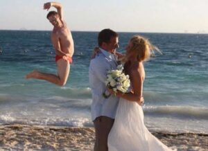 In the photo, behind the two newlyweds, a man appears at a certain moment who was not an acquaintance of the couple and, wanting to intentionally ruin their picture, he enters the frame of all splendor. Dressed for the beach, in bare skin, wearing only a pair of shorts and a pair of glasses in his eyes, he jumps with his chest forward imitating a position worthy of comedy movies, fixed when the photographer presses the shooting button.