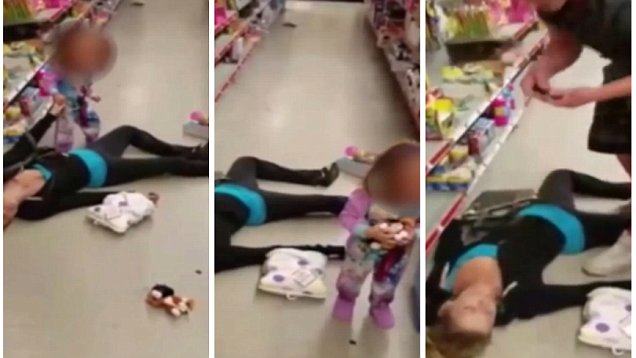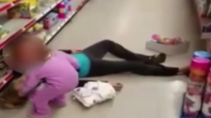 A woman fainted in the middle of a supermarket and her very young daughter screams and cries touching her mother’s body, which does not move at all. She takes her hand and repeatedly tries to pull her mother up, but she has no strength, and the mother remains motionless on the floor, then the little girl tries to lift her head, grabs her chin, but to no avail.