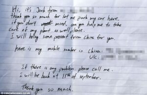 “Hi, it’s Jack. Thank you so much for letting me park my car here if you don’t mind, can you help me to take care of my plant as well, please. I will bring some presents from China for you. Here is my phone number from China and the UK. If there is any problem please call me. I will be back on the 15th of September. Thank you so much!”