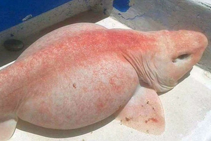 When they looked more closely and realized what they had found, they could not believe it: it was a shark of a species that is known for its swollen belly, with a rare disease called leukemia, which makes all the pigment in the skin disappear. The swollen belly is a known defense mechanism, when they feel threatened by a predator, sharks swallow large amounts of water and a stomach bag swells, making it much harder for a predator to swallow.