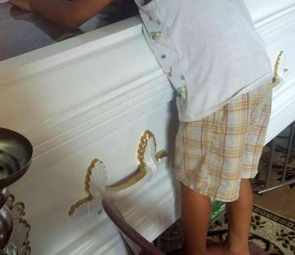 What answer can we give to a child who asks, “Why doesn’t my mother sleep next to me?” Our heart breaks… He took a chair and with his help, he climbed on the coffin to hug his mother for the last time, according to Perfect Media.